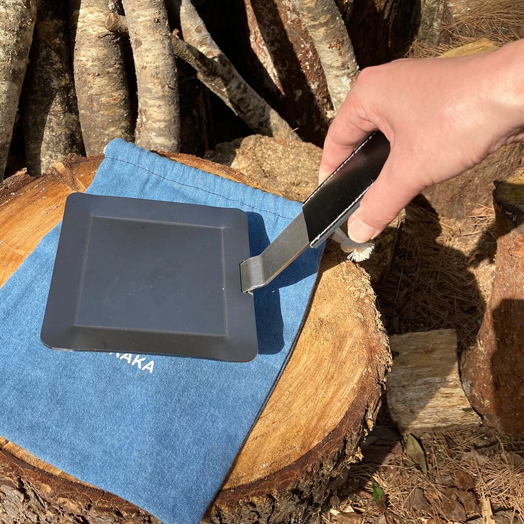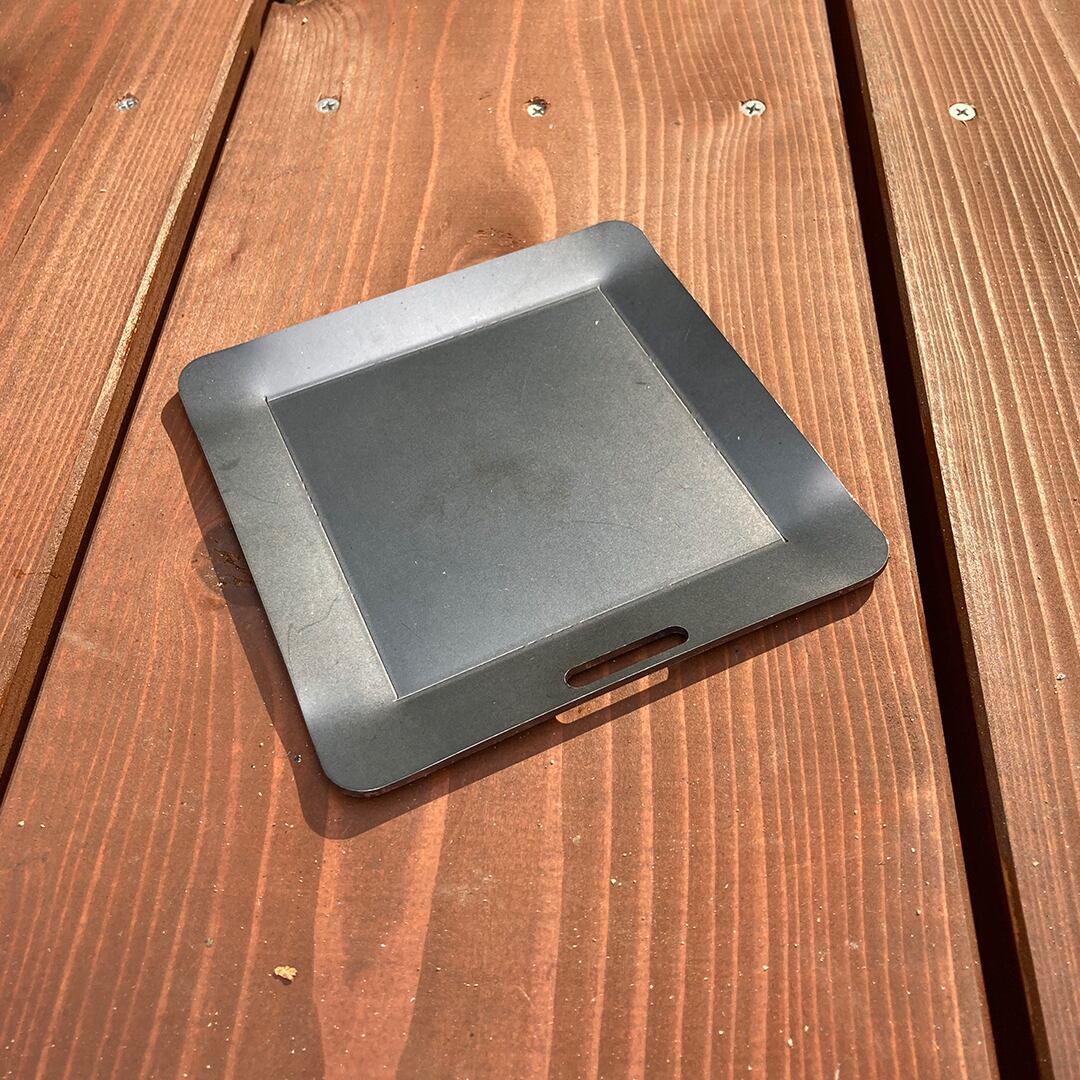 この鉄板のポイントは鉄板の四方に少し角度がついており、多少の油はこぼれ落ちにくいかたちです。